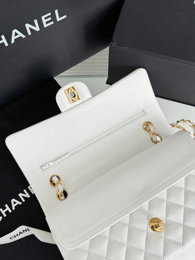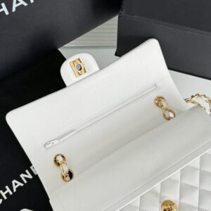 Premium Fake CHANEL CHANEL Classic Flap 25cm White (25cm) in White crafted in premium leather. This replica mirrors the original’s proportions with polished metal hardware and durable fabric lining. Expect precise stitching, clean edges and well-aligned patterns, giving a convincing imitation that balances durability and elegance. Color and finish remain faithful to CHANEL codes, while interior space is tuned for daily use. It offers runway style at a smart, wallet-friendly cost, ideal for collectors seeking a CHANEL replica bag that respects the design DNA. Easy for work, travel and city days.