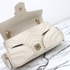 1:1 Quality Replica Gucci Marmont 2.0 GG Shoulder Bag White in White crafted in matelasse leather. This replica mirrors the original’s proportions with antique gold GG hardware and microfiber lining. Expect a structured silhouette with reinforced stress points, giving a convincing imitation that balances durability and elegance. Color and finish remain faithful to Gucci codes, while interior space is tuned for daily use. It offers luxury presence without the boutique price tag, ideal for collectors seeking a Gucci replica bag that respects the design DNA. Easy for work, travel and city days. Choose this super clone if you want premium build, iconic style and long-term reliability without overspending.