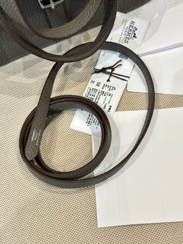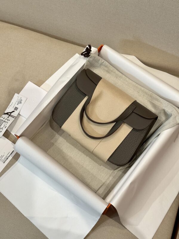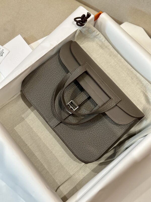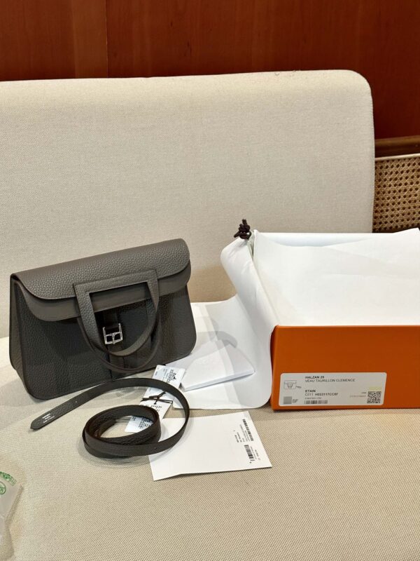 Replica Hermes Halzan Dark Grey in Grey crafted in premium leather. This replica mirrors the original’s proportions with polished metal hardware and durable fabric lining. Expect careful construction calibrated to match the original, giving a convincing imitation that balances durability and elegance. Color and finish remain faithful to Hermes codes, while interior space is tuned for daily use. It offers an affordable designer bag alternative with the same look and feel, ideal for collectors seeking a Hermes replica bag that respects the design DNA. Pairs effortlessly with casual or dressed-up looks.